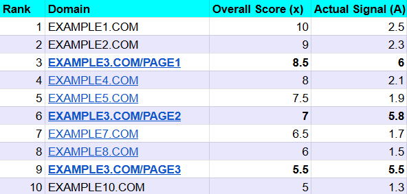 You can see that EXAMPLE3.COM has three pages ranking in the top 10, and their Signal A scores are suspiciously high compared to the others.